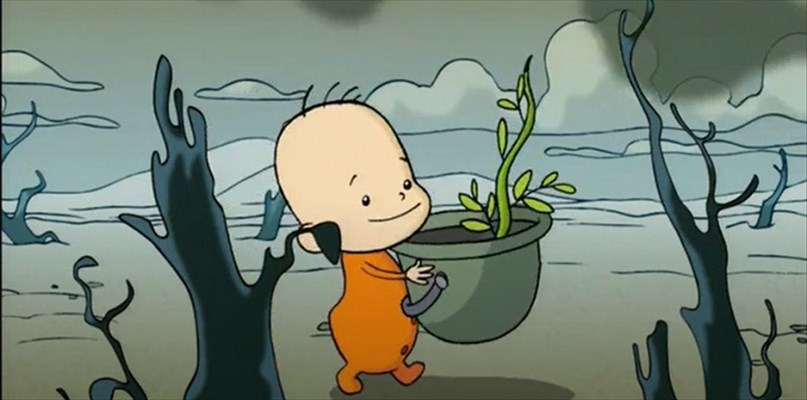 La guerra viene impersonata da un terribile drago metallico che incenerisce tutto quello che incontra. Un fiore nasce dalle macerie e riesce a fermarlo…