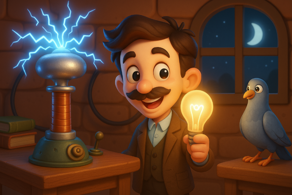 Crescendo, Nikola costruì una macchina tutta scintille e rumori che faceva ballare l’elettricità: era la bobina di Tesla, e sembrava un piccolo spettacolo di magia!